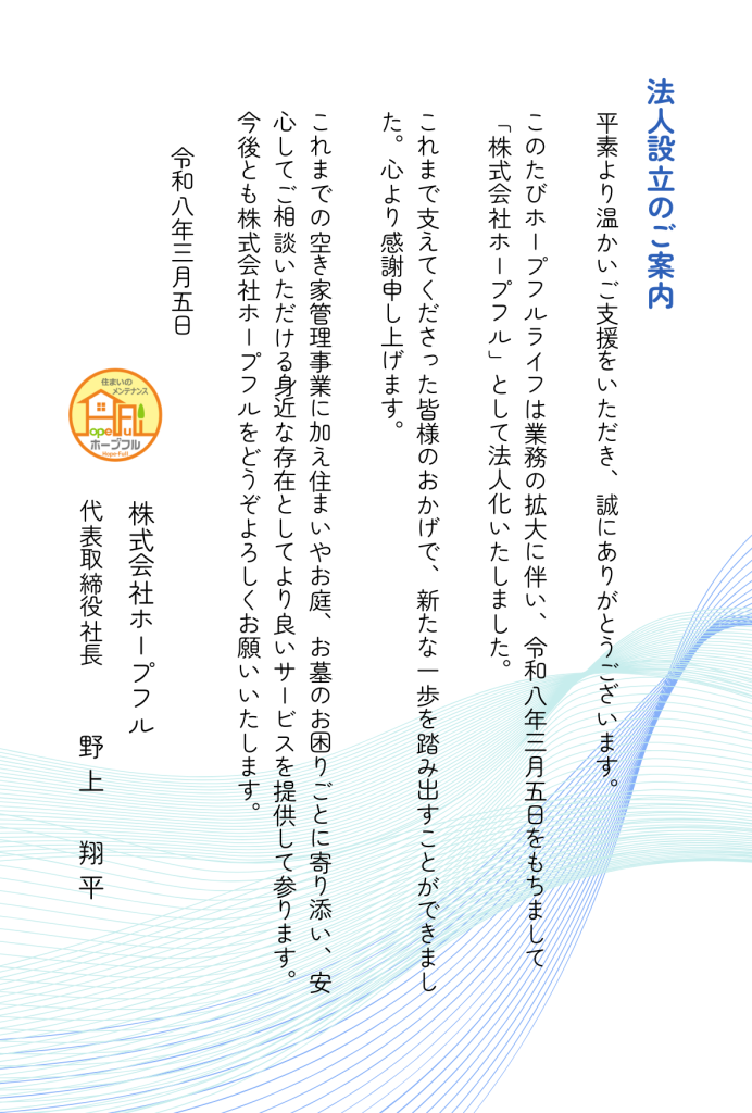 このたびホープフルライフは業務の拡大に伴い、令和8年3月5日をもちまして「株式会社ホープフル」として法人化いたしました。